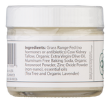 Ingredients: Grass Range Fed (no hormones or antibiotics) Cow Kidney Tallow, Organic Extra Virgin Olive Oil, Aluminum Free Baking Soda, Organic Arrowroot Powder, Zinc Oxide Powder (non-nano), essential oils (Tea Tree and Organic Lavender)