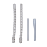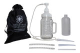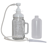 Hold the screw cap with one hand and turn the pump plunger/spout counterclockwise with the other hand to open.  The plunger will pop up, like a shampoo bottle dispenser, once you rotate it far enough. Attach the longest draw straw to the inside bottom on the pump with the diagonally cut end pointed toward the bottom of the jar to siphon up the liquid. Add the finger grip by inserting the draw straw through the center ring of the finger grip. The finger grip should be positioned so the underside contours allow for your fingers to hold the whole Enema Fix while pumping.  See the picture of the assembled Enema Fix for the correct finger grip position. Securely screw the pump assembly onto the jar adapter.  Attach the tubing adapter to the pump spigot and make sure to tightly push on this connection.
